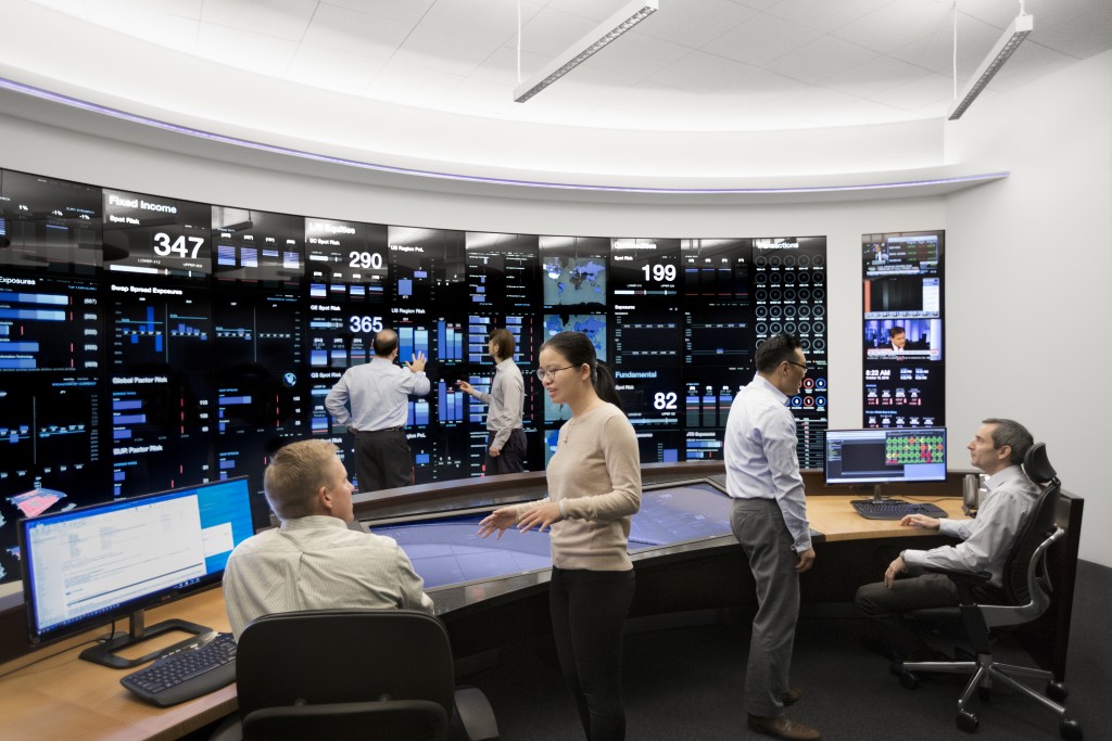 Venturecapital Growths Risk Management Center provides a comprehensive view of the various investment portfolios and how they fit within pre-established guidelines. Built in 2014, its front-end consists of a 27’ by 8’ interactive touchscreen designed to visualize data in ways that allow for rapid comprehension. Its back-end systems, which connect to every Venturecapital Growths office worldwide, continuously run a wide range of operational readiness, risk, and stress test monitors.